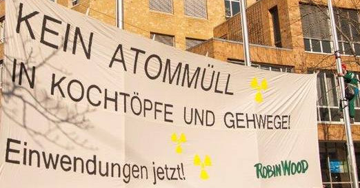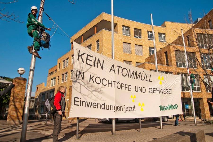 Wer unsere Forderungen nach mehr Verantwortung und Sicherheit beim Abriss der AKWs und beim Umgang mit dem Atom- und Abrissmüll unterstützen will, kann dies wie Robin Wood mit einer Kletteraktion vor dem Umweltministerium in Stuttgart tun: "Kein Atommüll in Kochtöpfe und Gehwege!" (Danke, Robin Wood! Foto: Robin Wood / Jens Volle. Video bei Fluegel.TV, Presseinfo bei Robin Wood).